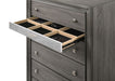 ACME Naima Chest, Gray, 34" x 17" x 51"H, 110lbs. Features: - 6 Drw (Jewelry Drawer) - Casegood Drawer: GLIDE Center Metal, Dovetail English Front & Back, Fully Finished Inside (Full Ext. & Felt-Lined Only for Jewelry Drawer), Hardware: Chrome Finish Materials: Wood, Acrylic Trim, Veneer, Composite Wood